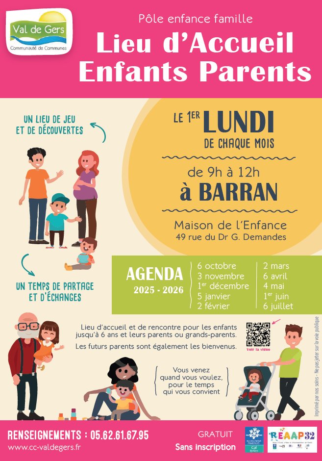 Le 1er lundi de chaque mois de 9h00 à 12h00 dans les locaux du Jardin D'Enfants de Barran.