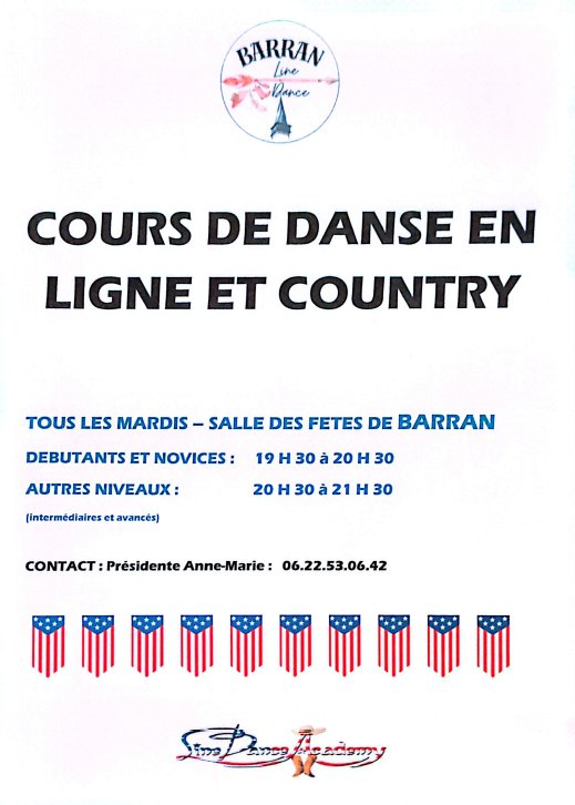 L'association Barran Line Dance vous propose des cours de danse country tous les mardis à partir de 19h30 au Foyer.