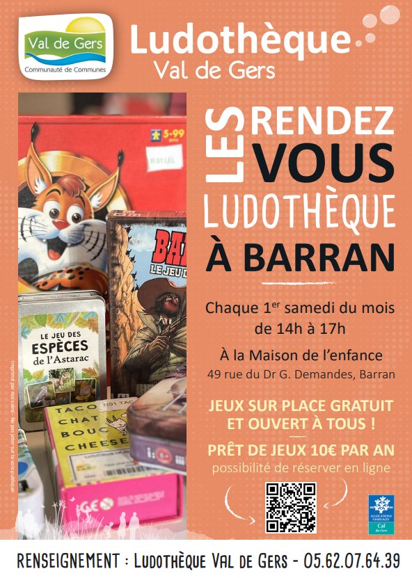 A partir du samedi 3 janvier la Ludothèque de Val De Gers vous donne rendez-vous chaque premier samedi du mois de 14 heures à 17h à la maison de l’enfance à Barran.