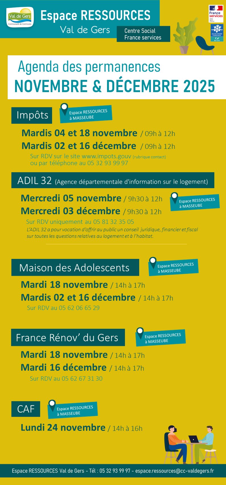 đ Retrouvez l'AGENDA des permanences de l'Espace RESSOURCES Val de Gers pour les mois de Novembre et DĂ©cembre 2025.